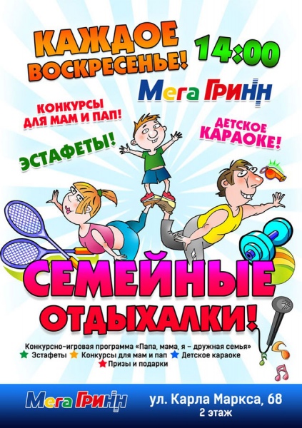 7 августа с 16:00 на летней площадке МегаГРИННа конкурсно-игровая программа «Семейные отдыхалки». Мамы, папы поспешите и детей своих ведите, будем вместе отдыхать, всей семьёй шутить, играть, в караоке песни петь, чудо-мультики смотреть. 7 августа, 14:00 летняя площадка МегаГРИННа. Информация по тел. 73-35-41. Без возрастных ограничений.