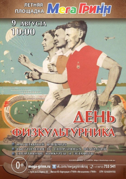 9 августа с 10:00 на летней площадке МегаГРИННа отмечаем «День физкультурника». Масштабный флешмоб, выступление от спортивных федераций, спортивные конкурсы и эстафеты. Ждем Вас 9 августа, 10:00 на летней площадке МегаГРИННа. Информация по тел. 73-35-41. Без возрастных ограничений.