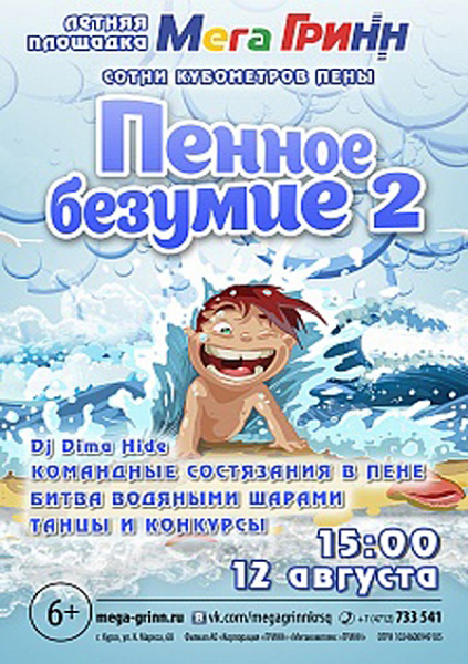 В пятницу, 12 августа, с 15:00 на летней площадке МегаГРИННа СОТНИ КУБОМЕТРОВ ПЕНЫ в продолжение грандиозного пенного шоу «Пенное безумие 2»!