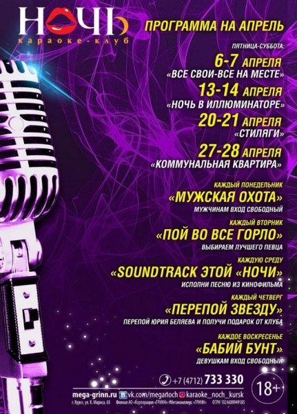 ВХОД СВОБОДНЫЙ! (18+) Информация и резерв столов по телефону (4712) 733-555.