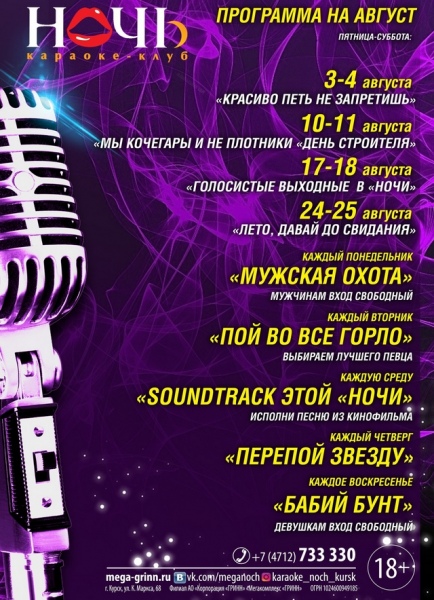 ВХОД СВОБОДНЫЙ! (18+) Информация и резерв столов по телефону (4712) 733-555.