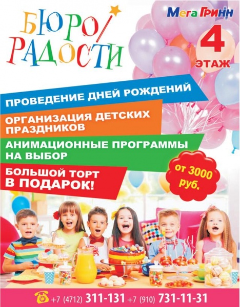 «Бюро радости» предлагает: проведение ДНЕЙ РОЖДЕНИЙ, организация ДЕТСКИХ ПРАЗДНИКОВ, АНИМАЦИОННЫЕ ПРОГРАММЫ на выбор, БОЛЬШОЙ ТОРТ в ПОДАРОК!
