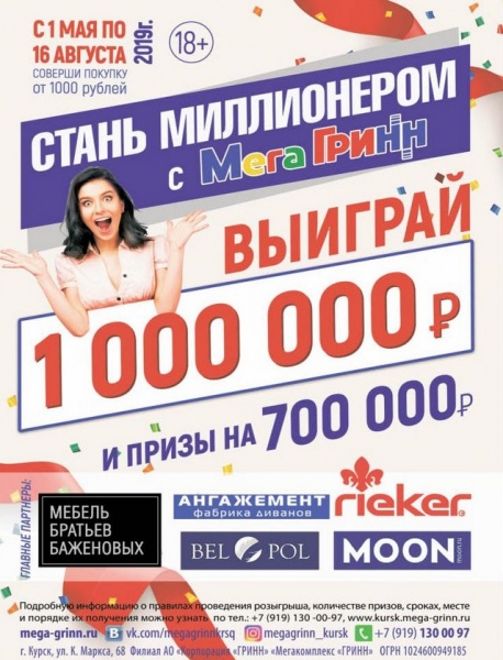 Подробную информацию о правилах проведения розыгрыша, количестве призов, сроках, месте и порядке их получения можно узнать по тел. +7(919)130-00-97 и на сайте www.kursk.mega-grinn.ru