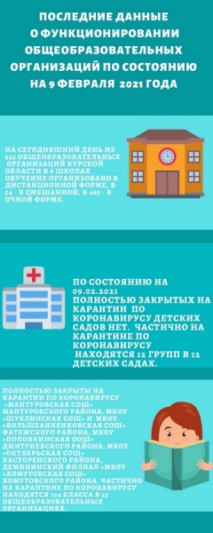 Там отметили, что на 9 февраля в Курске и районах 465 школ работают в очном режиме, 6 — на дистанционном, 54 — в смешанном.