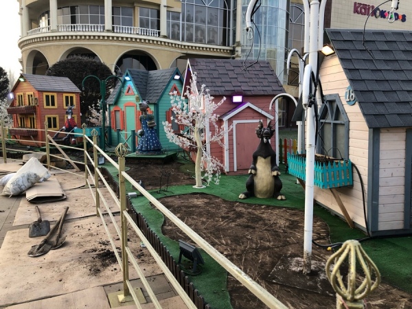 Сегодня композицию начали разбирать. Кашпо уже увезли, сейчас рабочие грузят в машину фигуры и сами конструкции домиков. В скором времени на этом месте появятся новогодние декорации.
