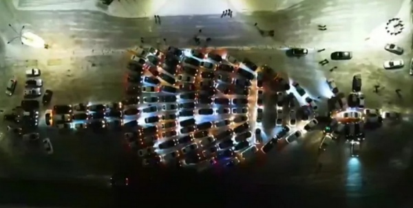 Десятки машин поставили на главной площади города так, что получилось гигантское светящееся новогоднее дерево.