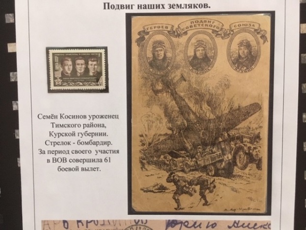 Отдельный выставочный лист содержит почтовую карточку и марку, посвящённые экипажу самолёта Пе-2, штурманом которого был уроженец Курской области, лейтенант Семён Косинов. Здесь же расположена вырезка из газеты, описывающая подвиг лётчиков, которые ценой своих жизней совершили наземный таран колоны противника.