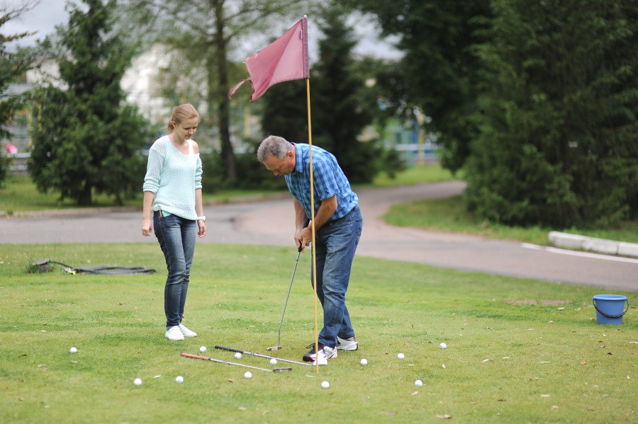 Владимир Федорович выстраивает мячи на грине, такое название носит площадка перед финальной лункой. Трава тут не выше сантиметра, и ровняют ее практически каждый день. «Ноги слегка согнуты в коленях, спина ровная, – учит он, передавая патер. – Клюшка, мяч и лунка должны оказаться на одной прямой. Прямо в лунку! Да вы прирожденные игроки». Нашим маленьким успехам Владимир Пигорев радуется, будто мы уже выиграли, как минимум, российский чемпионат.
