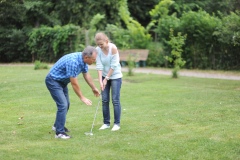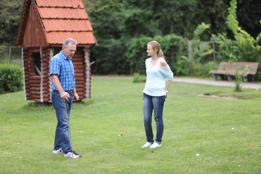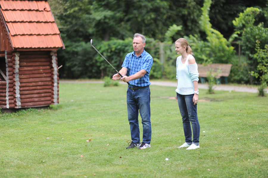 Чтобы спроектировать ландшафт, пришлось вызвать специалиста из Москвы. Только через год 100-метровое 4-луночное поле было готово к игре. Рядом обустроили небольшой искуственный водоем, с деревянным мостиком и декоративной избушкой. Пейзаж изменился до неузнаваемости. Сегодня сюда приезжают не только спортсмены, но и молодожены, чтобы сделать фото на память.