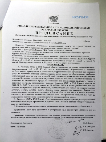 По результатам рассмотрения дела комиссия Курского УФАС выдала комитету ЖКХ и ТЭК предписание отменить или изменить акт, противоречащий антимонопольному законодательству. Такое решение, кстати, стало первым в России!