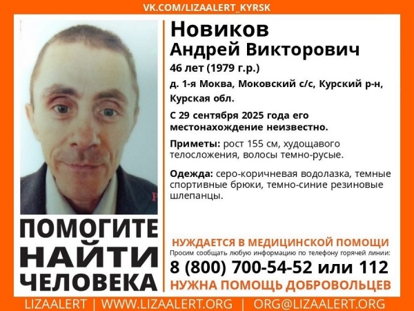 Поисковый отряд «Лиза Алерт» Курской области объявил сбор добровольцев на поиск 46-летнего мужчина. Он пропал 29 сентября. Уточняется, что курянин нуждается в медицинской помощи.