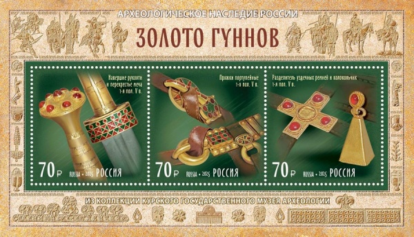 16 октября торжественная церемония специального гашения почтового блока из трех марок серии «Археологическое наследие России» состоялась в Курском государственном музее археологии. Знаки почтовой оплаты посвящены знаменитому кладу — золоту гуннов, найденному в Курской области. Обнаруженным предметам около полутора тысячи лет.