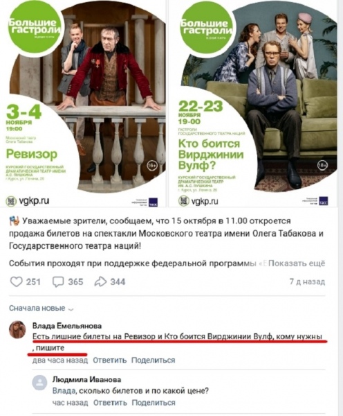 Тем временем под постом в группе Курского драмтеатра сразу несколько человек предлагают продать «лишний билетик». В личной переписке продавцы сообщают, что билеты есть на оба спектакля, цена — 2500 рублей в партер и 2000 рублей — на балкон. Изначально билеты стоили от 1000 до 1400 рублей. Они не скрывают, что выкупили билеты на старте продаж и теперь перепродают дороже.