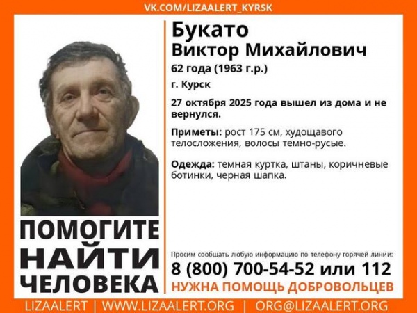 По данным волонтеров, пропал Букато Виктор Михайлович. 27 октября он вышел из дома и не вернулся. Местонахождение курянина неизвестно.