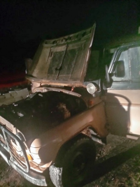 Горел автомобиль УАЗ. Пылающую машину потушили прибывшие пожарные.