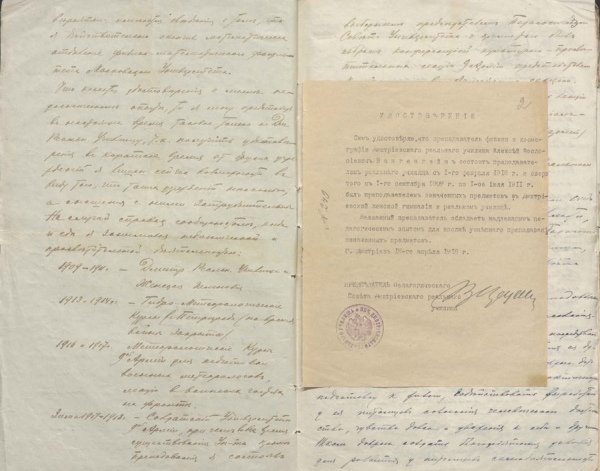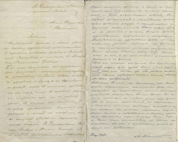 Рукописный текст — это прошение в адрес Дмитриевского Ревсовета. В первой части рукописи Вангенгейм просил разрешить преподавать математику в местном реальном училище, во второй части он изложил свои взгляды на воспитание новой, свободной личности.