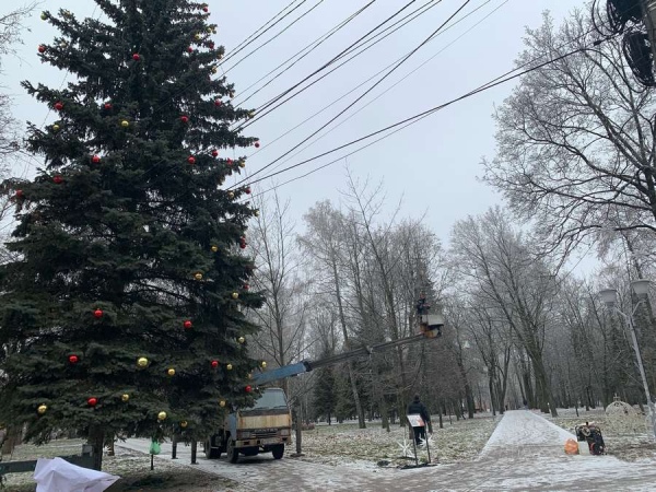 В курском парке Бородино сегодня украшают высокую ель. Для этого в парк приехала вышка.