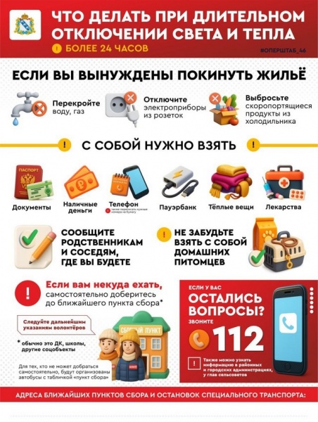 Вечером 23 декабря в оперативном штабе Курской области решили напомнить жителям региона о правилах безопасного поведения, заявив, что внезапные отключения света или тепла – время не паниковать, а правильно действовать.