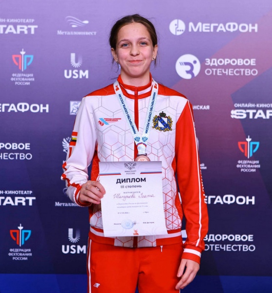 В поединке за выход в финал наша юная рапиристка уступила Ирине Зориной из Подмосковья – 7:15, в итоге завоевав бронзовую медаль юниорского первенства страны.