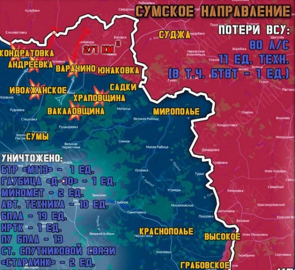 На Теткинском и Глушковском участках фронта, непосредственно у самой границы Курской области, существенных изменений пока нет. Российская авиация наносила удары по позициям ВСУ возле села Новых Вирок в Сумской области.