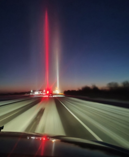 «По трассе при -20°С очень классное явление, все источники света дают столбы света в небо!» — сообщил автор снимка.