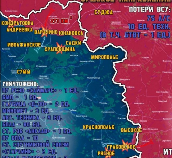 На Теткинском и Глушковском участках фронта существенных изменений не зафиксировано. Артиллерия била по позициям ВСУ возле сумского села Рыжевки у границы Курской области.