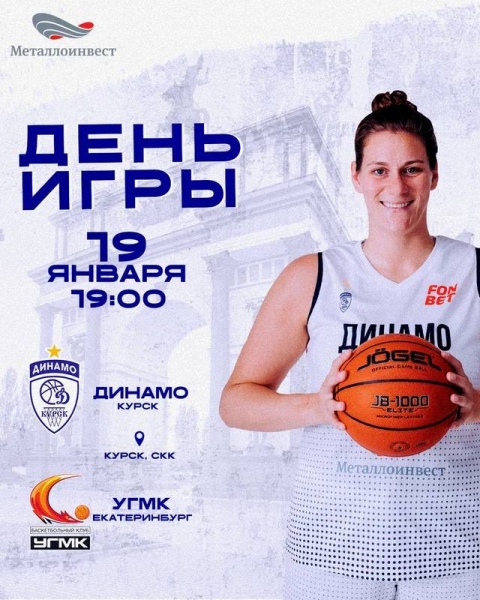 В понедельник, 19 января в Курске большой баскетбол — состоится битва грандов российского женского баскетбола. Встречаются вторая и первая команды регулярного чемпионата женской премьер-лиги. Курское «Динамо» принимает многократного чемпиона страны — УГМК из Екатеринбурга, пока не познавшего горечи поражений в этом сезоне. Начало встречи в СКК на улице Энгельса в 19:00.