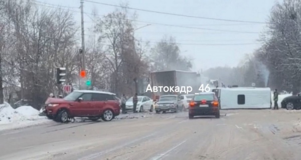 Серьезная авария произошла сегодня на перекрестке улиц Фрунзе и Дубровинского в Курске. По предварительным данным, внедорожник Range Rover врезался в микроавтобус, от чего тот опрокинулся.