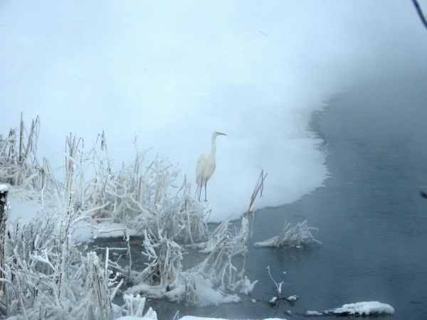 Серию своих фотографий курянка назвала так: «Снежно — льдисто — туманная зарисовка». «В крещенские морозы на Теплом канале и дамбе рядом вода, конечно же, и не думала замерзать, от нее клубами поднимался туман, ниже дамбы крутились льдины-блины. Большая белая цапля смотрелась в этом антураже очень органично», — написала девушка.