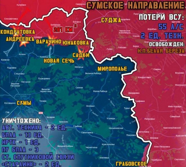 29 января на Сумском направлении Северяне нарастили темпы наступления при активной поддержке артиллерии и ТОС-1А «Солнцепек». Российские подразделения продвинулись вглубь Сумской области на 13 участках в Сумском и Глуховском районах. Освобождено от ВСУ приграничное село Белая Береза в Улановском сельсовете Глуховского района. Расчеты ударных БпЛА «Герань-2» точечно работали по тыловым районам противника.