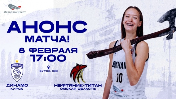 В воскресенье, 8 февраля, в 17:00 в СКК на улице Энгельса «Динамо» (Курск) проведет заключительный матч первого этапа чемпионата женской премьер-лиги. Наша команда под руководством нового тренера сыграет дома против «Нефтяника-Титан» из Омска.