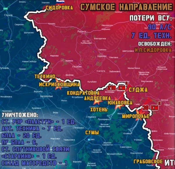 На Сумском направлении Северяне наращивают темпы наступления, возле российской границы со стороны Рыльского района нашт штурмовых подразделения овладели населенным пунктом Сидоровка Глуховского района Сумской области. Он зачищен от ВСУ, как ранее Комаровка и Белая Береза.