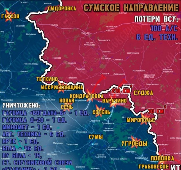 9 февраля на Сумском направлении Северяне сохраняли высокие темпы наступления при поддержке артиллерии и «Солнцепеков». Продвижение вглубь Сумской области отмечено на 18 участках в Сумском, Глуховском и Краснопольском районах.