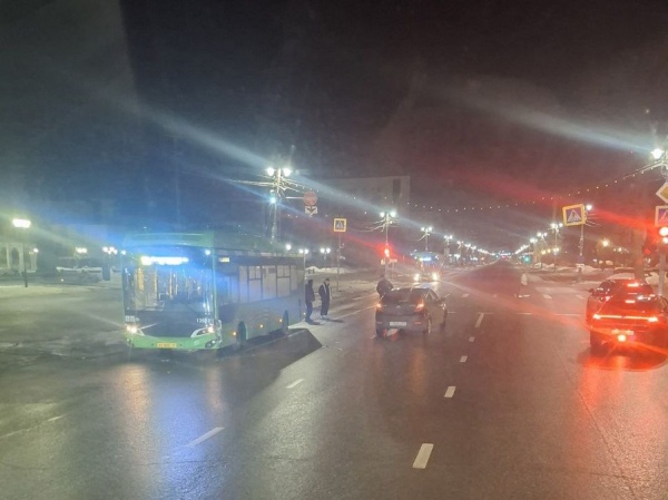 По предварительным данным очевидцев, выложивших фото с места в паблике «Автокадр_46», поздним вечером на улице Ленина возле ТЦ «Пушкинский» столкнулись автобус и легковой автомобиль.