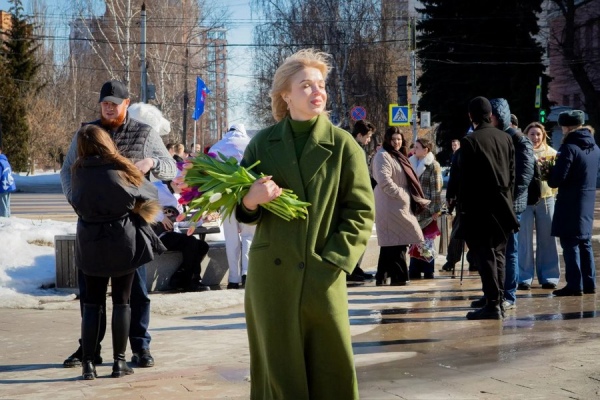 В центре города — на улице Ленина и Театральной площади молодые добровольцы раздавали курянкам всех возрастов тюльпаны.