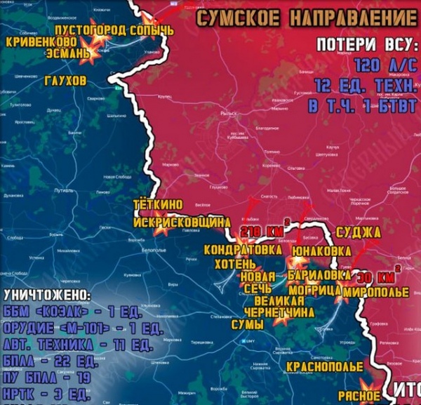 Российские авиация, военные химики и операторы ударных БПЛА нанесены удары по позициям ВСУ возле Бариловки, Искрисковщины, Кривенково, Мирополья, Могрицы, Новой Сечи, Пустогорода, Хотени и Эсмани.