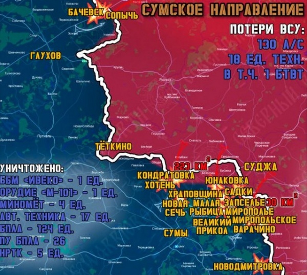 В Шосткинском районе противник формирует возле Бачевска сводные штурмовые группы, российская армия наносит по ним огневое поражение. ВСУ продолжает переброску живой силы под Сумы с других участков фронта. В частности, расчеты БПЛА, чей возраст не достиг 25 лет, из Харьковской области,.