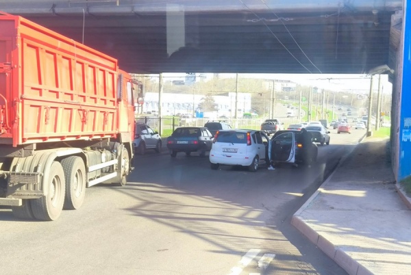 На улице Сумской автомобили столкнуцлись в правом ряду под путепроводом в сторону улицы Дзержинского.