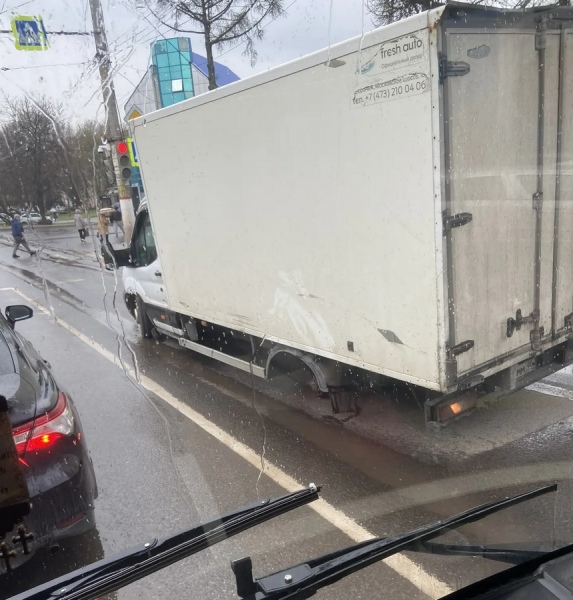 Огромная пробка возникла из-за грузового фургона, у которого отлетело колесо. Говорят, что стоит он там еще с ночи.