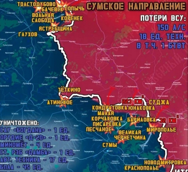 Российские войска наносили удары по позициям ВСУ возле Атинского, Бариловки, Великой Чернетчины, Мирополья, Песчаного, Таратутино, Толстодубово и Ястребщины,