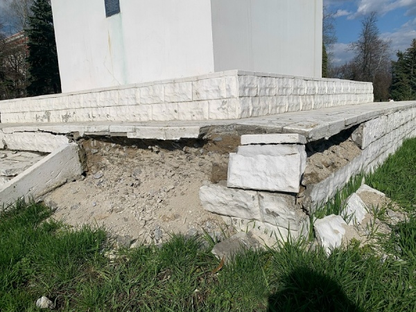 С одной стороны постамента отвалилась плитка и рассыпается сама конструкция.