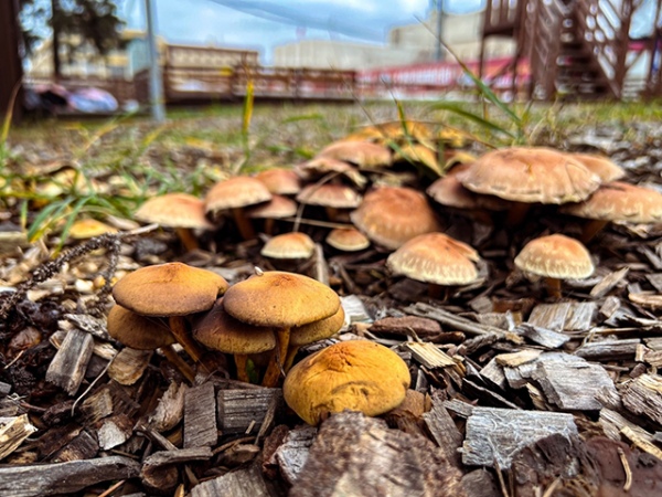 Неработающий каток в центре Курска весь зарос грибамиГрибы – это, скорее всего, ложные опята, растут небольшими группками на площадке, которая примыкает к катку. Землю там засыпали древесной щепой, вход закрыт для посетителей, вот и возникли почти идеальные условия для грибницы.