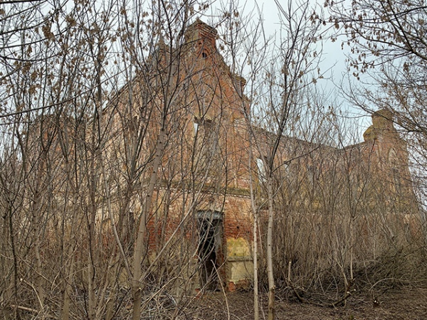 Как выглядело имение в свои лучшие годы, можно увидеть на старой фотографии, которую местные жители принесли на встречу. Это было величественное здание с элементами неоготики. Теперь зрелище печальное: руины, вокруг которых непроходимые заросли американского клена. К приезду высоких гостей прорубили тропинку, чтобы те смогли подойти поближе, но видно, что это место давно заброшено.