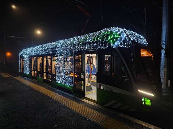 Работники «Курскэлектротранса» украсили машины сотнями метров сверкающих гирлянд. Например, на трамвай ушло 500 метров!