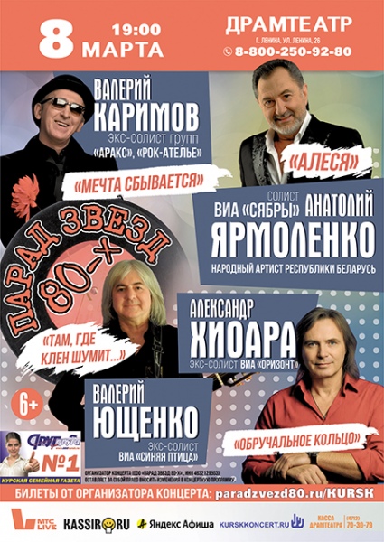Концерт состоится 8 марта. Место проведения: драмтеатр имени А. С. Пушкина. Начало концерта в 19:00. Стоимость билетов от 1200 руб. На нашем сайте paradzvezd80.ru/KURSK можно купить билеты без комиссии.