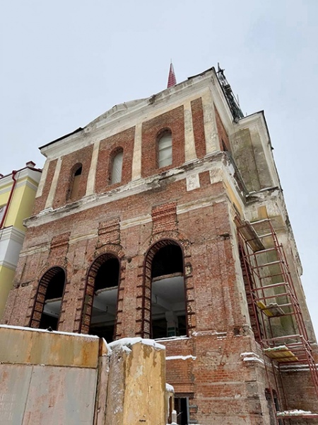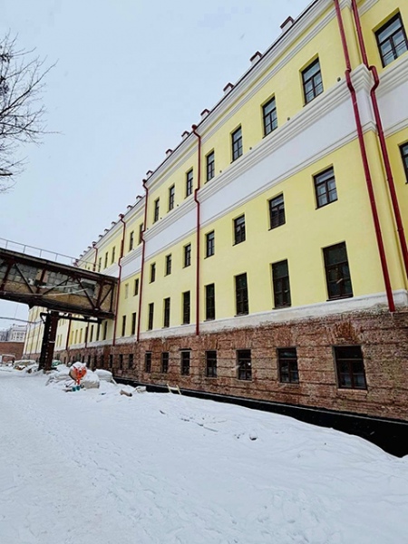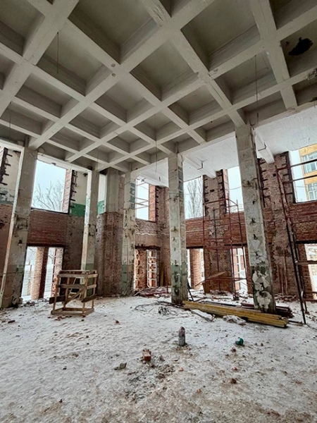 В здании идет монтаж трубопроводов отопления и теплового пункта, ставят насосы холодного водоснабжения, параллельно устанавливают железобетонные лестницы. Выполнены кровельные работы, частично окрашены фасады, на угловой башне переделаны оконные проемы. В двух залах этой башни сохранился великолепный оригинальный кессонный потолок, в одном из залов даже с декоративными розетками. Когда во время демонтажа всю эту красоту обнаружили под подвесными конструкциями, приняли решение сохранить исторические потолки.