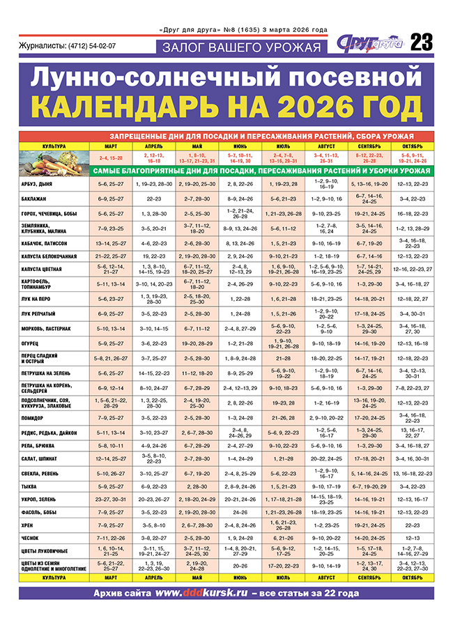 Уважаемые читатели! Публикуем посевной календарь на 2026 год.