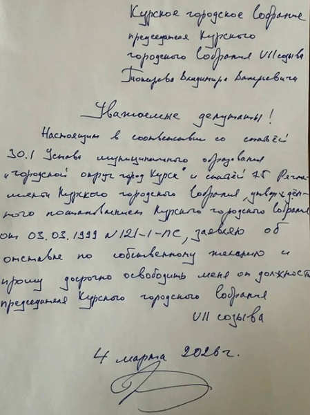 4 марта Владимир Токарев подал прошение об отставке с поста председателя Курского городского Собрания. Также он написал заявление о приостановке своего членства в «Единой России».