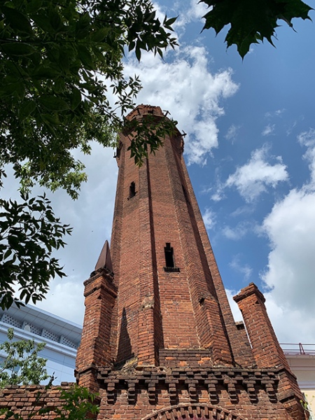 Водонапорная башня, которая в том числе служила пожарной каланчой, была построена в 1874 году. По углам была увенчана высокими острыми шпилями. Из здания поднимался граненый кирпичный ствол с металлической смотровой площадкой. Высота башни – 25,5 метра. После того как башню перестали использовать по назначению, жители соседних домов сделали из подземной части погреба.