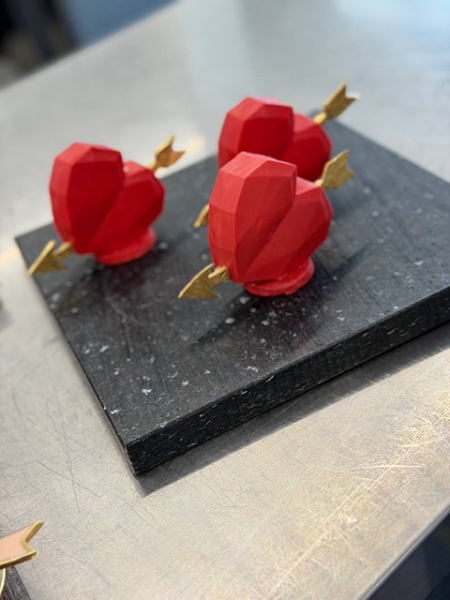 Пирожное по песне «Я за тебя умру» – это сердце, пронзенное стрелой, внутри – сочная клубника и теплые ноты глинтвейна. Каждый элемент – эмоция, которую можно попробовать на вкус.